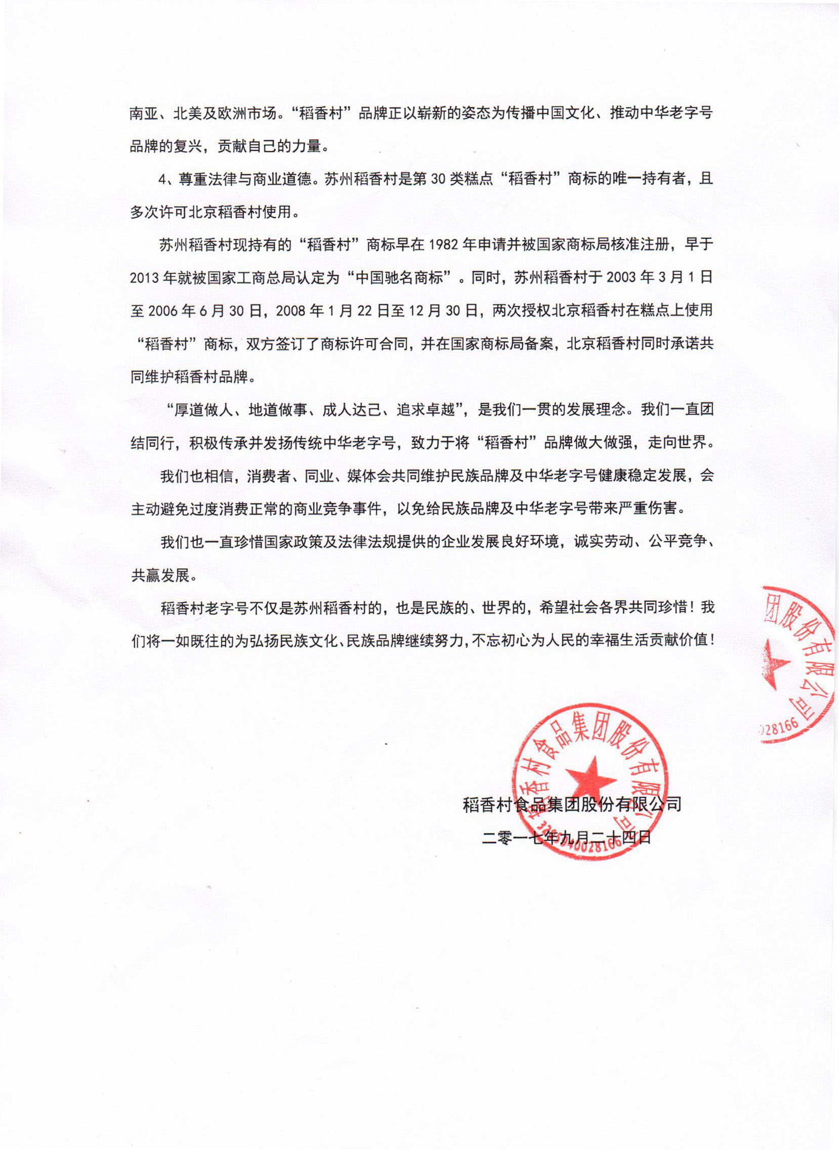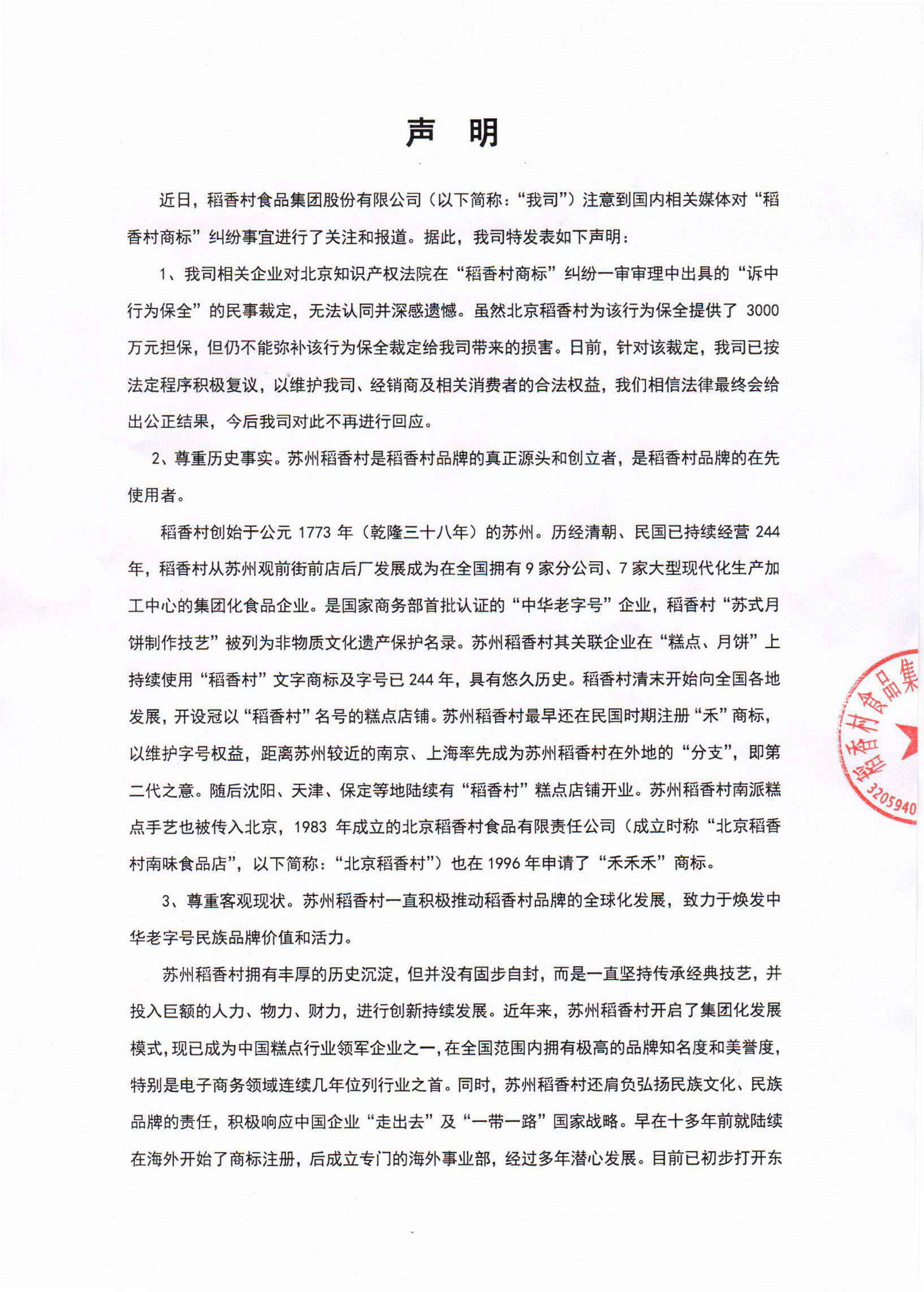 稻香村集團關(guān)于“稻香村商標(biāo)”糾紛事宜的聲明: ???